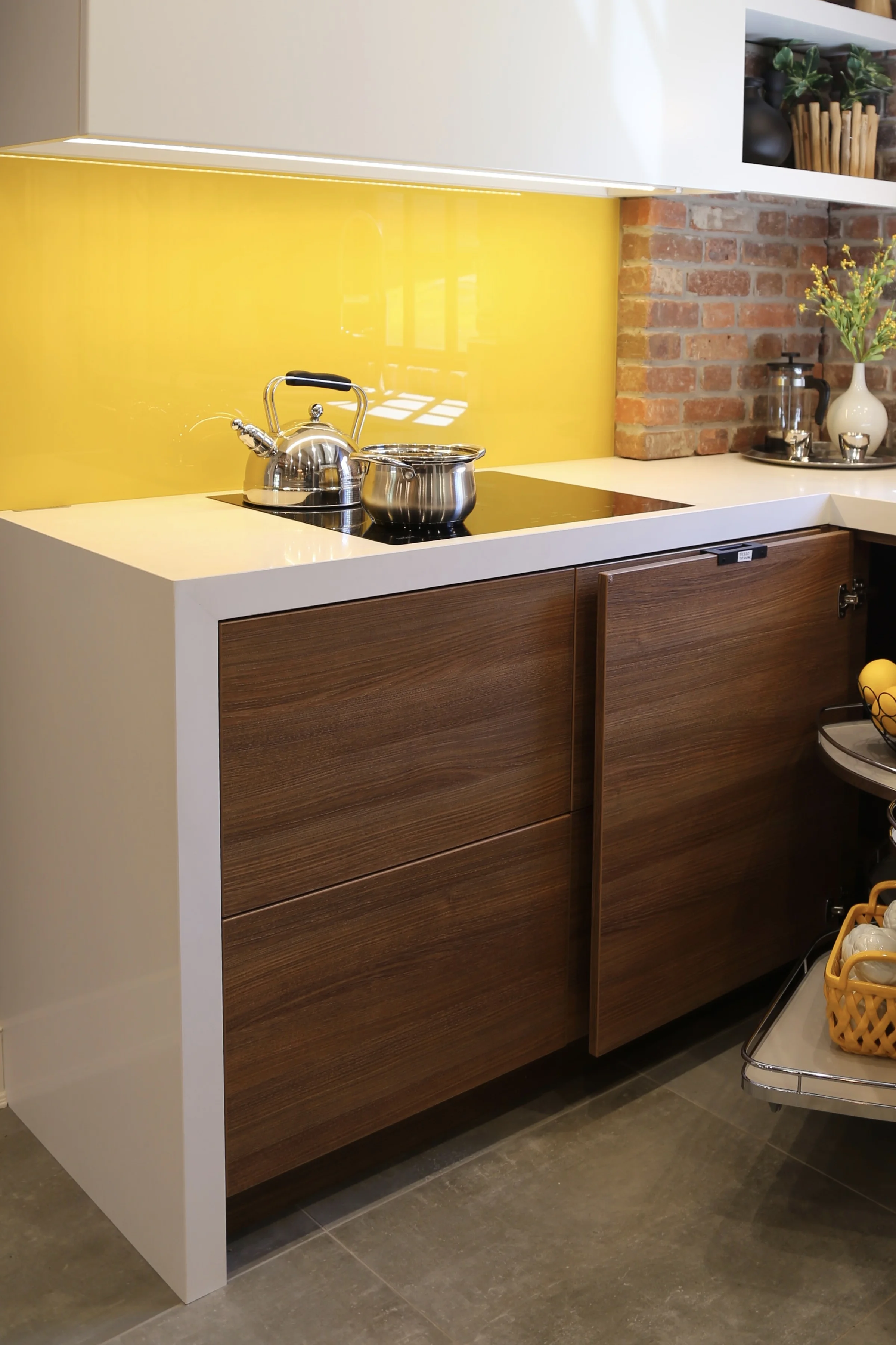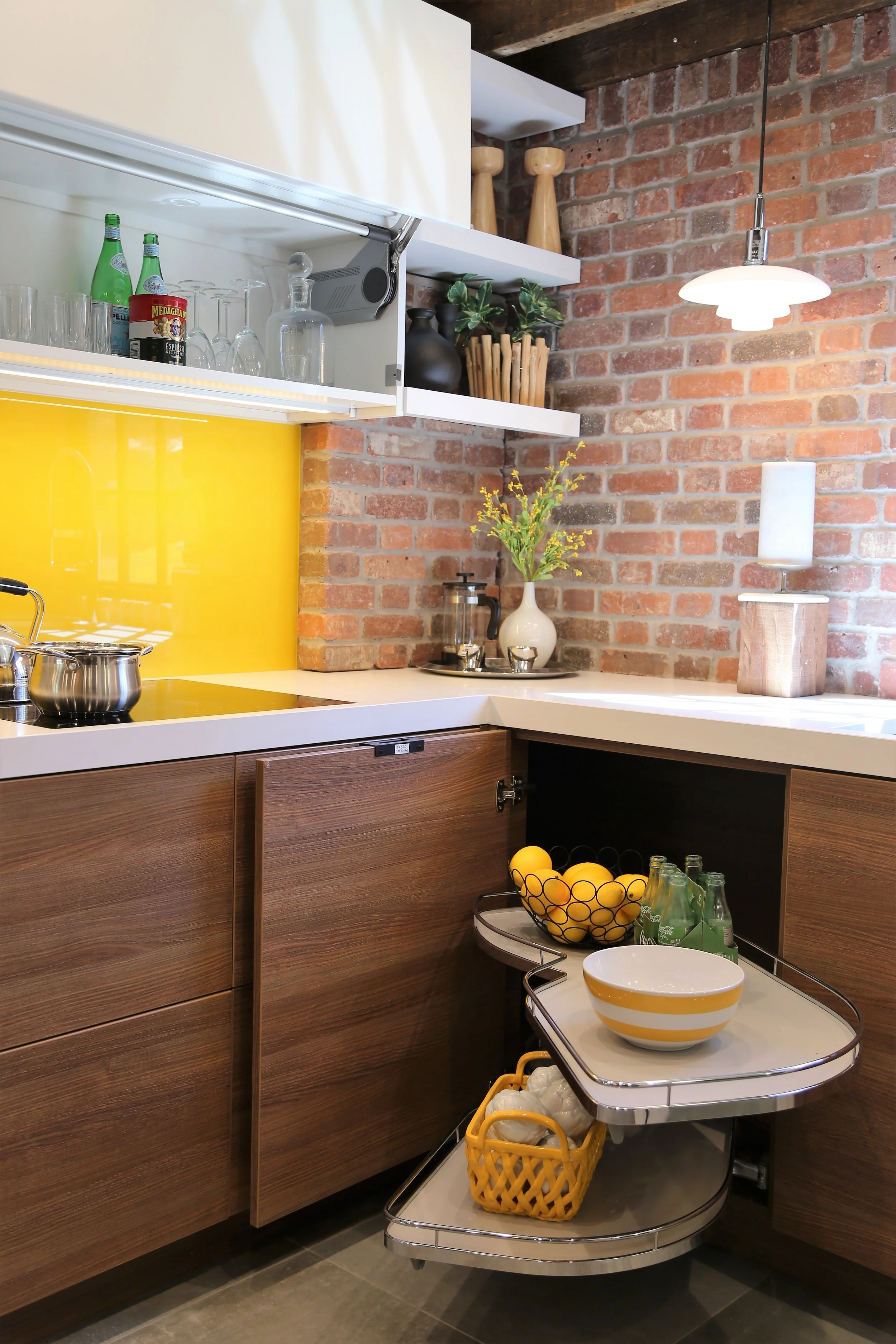 Upper cabinet doors open and close with a push of a button while lower cabinets are opened with a simple push on the drawer face. The corner cabinet is easily accessible with a LeMans II blind corner.